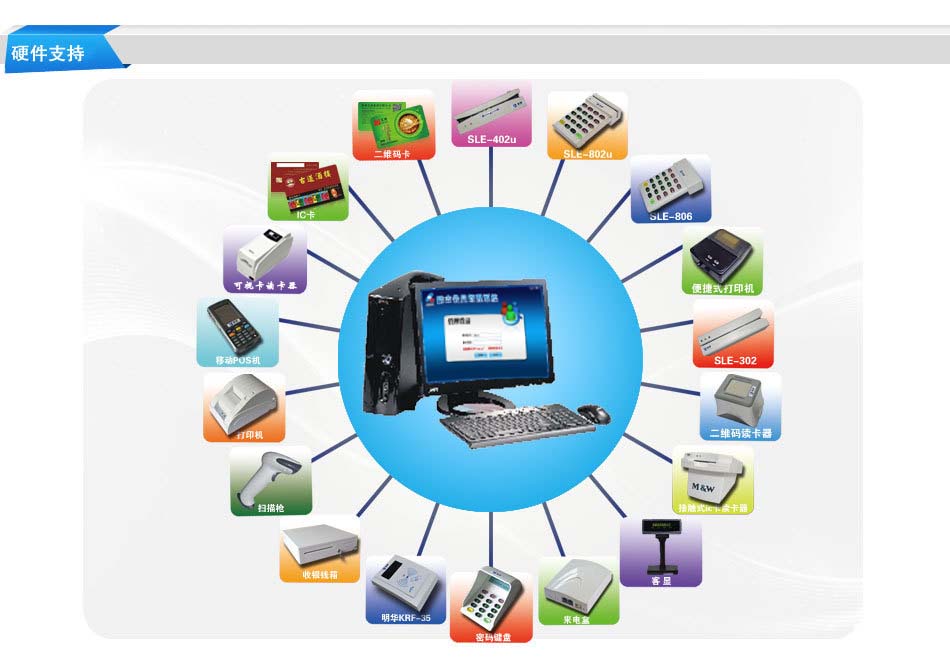 支持硬件:磁條刷卡器、ID卡感應(yīng)器、便捷式打印機(jī)、磁卡寫(xiě)卡器、二維碼讀卡器、接觸式IC卡讀卡器、可視卡讀卡器、客顯、來(lái)電盒、密碼鍵盤(pán)、收銀錢(qián)箱、掃描槍、打印機(jī)、移動(dòng)POS機(jī)。