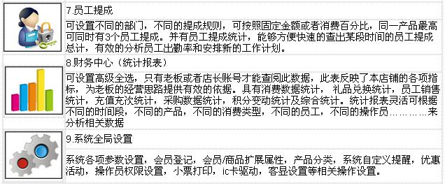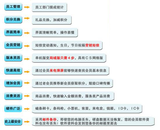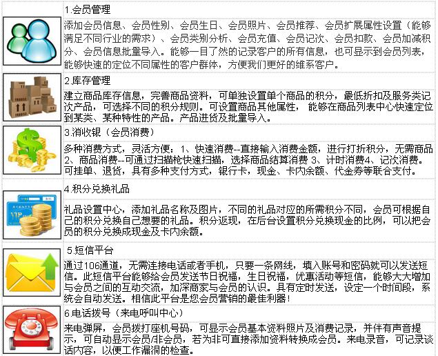 尤其在會員管理方面具有快速消費獲取積分,直接給會員加減積分,積分清零,會員換卡,會員掛失鎖定,會員充值,會員充次,會員快速計次消費等等,是一款功能適用面及其廣的會員軟件,超多的功能讓不同行業(yè)的客戶可以選擇一個適合自己的會員管理軟件。