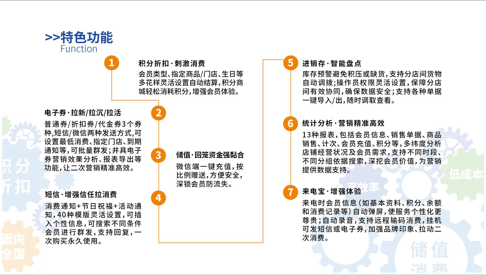 消費通知+節(jié)日祝福+活動通知,40種模版靈活設置,可插入個性信息,可搜索不同條件會員進行群發(fā),支持回復,一次購買永久使用。